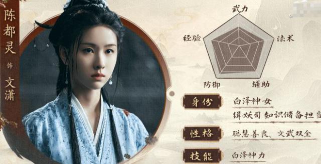 女主角由陈都灵扮演,她是白泽神女文潇,聪明善良,文武双全,爱恨分明。