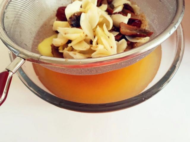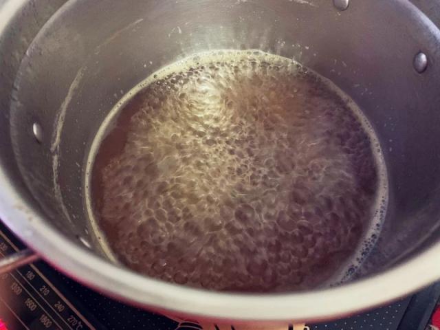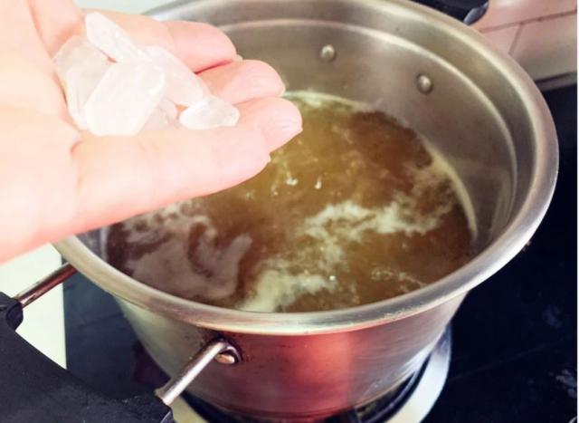 过滤后的汁液再次放入锅中煮沸,加入冰糖。