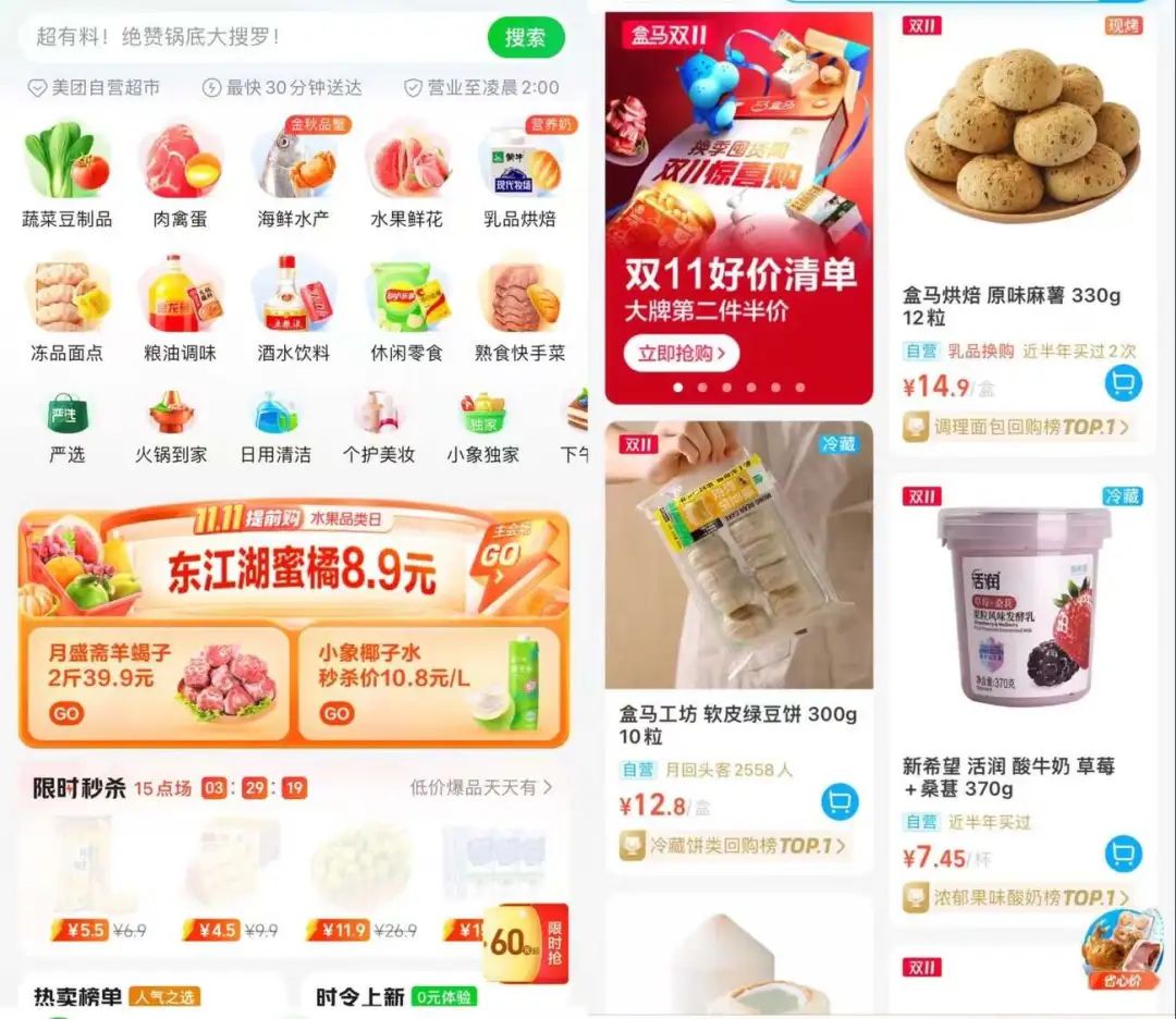 图片:双11美团APP小象超市入口页面(左),双11盒马APP页面(右),来源:听筒Tech截图