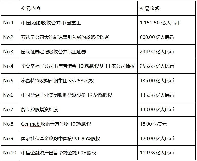 从交易规模来看,有17起超过100亿的M&A事件。其中,中国船舶吸收合并中国重工业的事件远远领先于1151.50亿元;万达子公司大连新达盟引进新战略投资的事件以600.00亿元的金额排名第二。