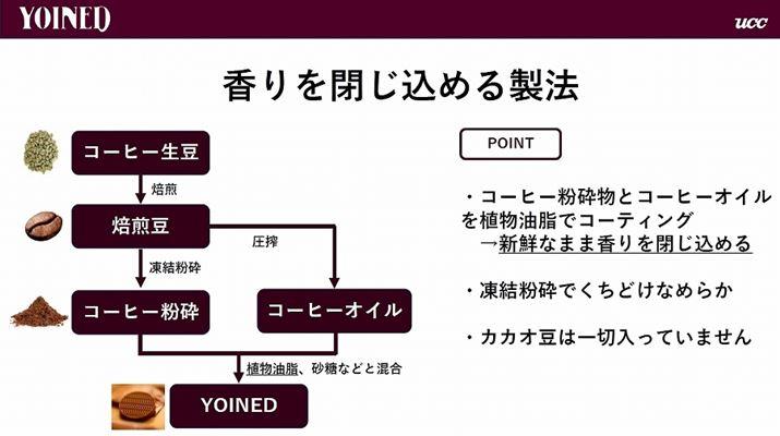根据UCC的说法,YOINED可以实现“鼻后香”,即吃了之后,鼻腔也能感受到口中的香味,而且“即使融化了,香味也会挥之不去”。[1]