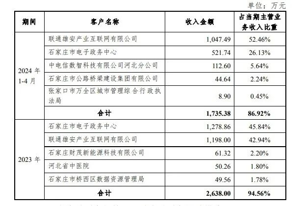 智能产业公司主要为政务、环保等领域客户的信息化建设提供解决方案、硬件产品和专业服务。2024年1-4月,前两位客户为公司提供了78.6%的收入。