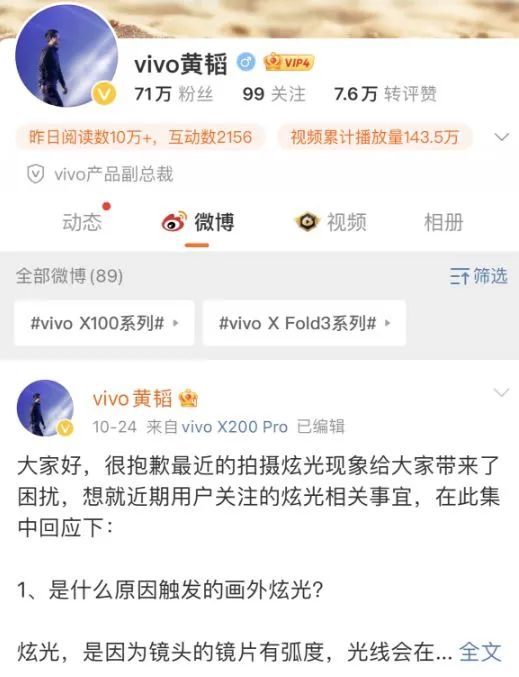 黄韬挺身而出,首先对存在的问题深表歉意,并详细解释了各种关于眩光现象的问题和讨论。他指出,vivo X200 Pro的镜头设计和光圈大小是容易引起眩光的重要因素。此外,他还承认vivo在商品检测中被忽视,并提出了一系列解决方案,包括软件更新和硬件外设升级。