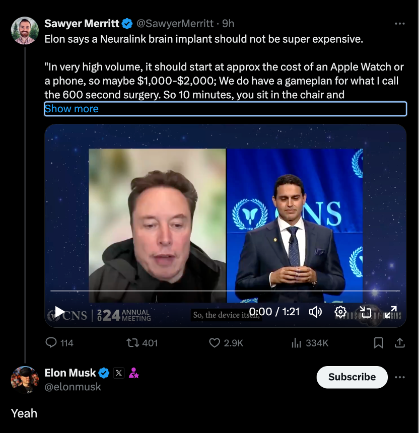 最近,2024年神经外科医师大会公布了特斯拉首席执行官埃隆・马斯克参加了会议,马斯克分享了他对脑机接口企业Neuralink和脑机接口技术的看法,并强调这些设备“不应该太贵”。