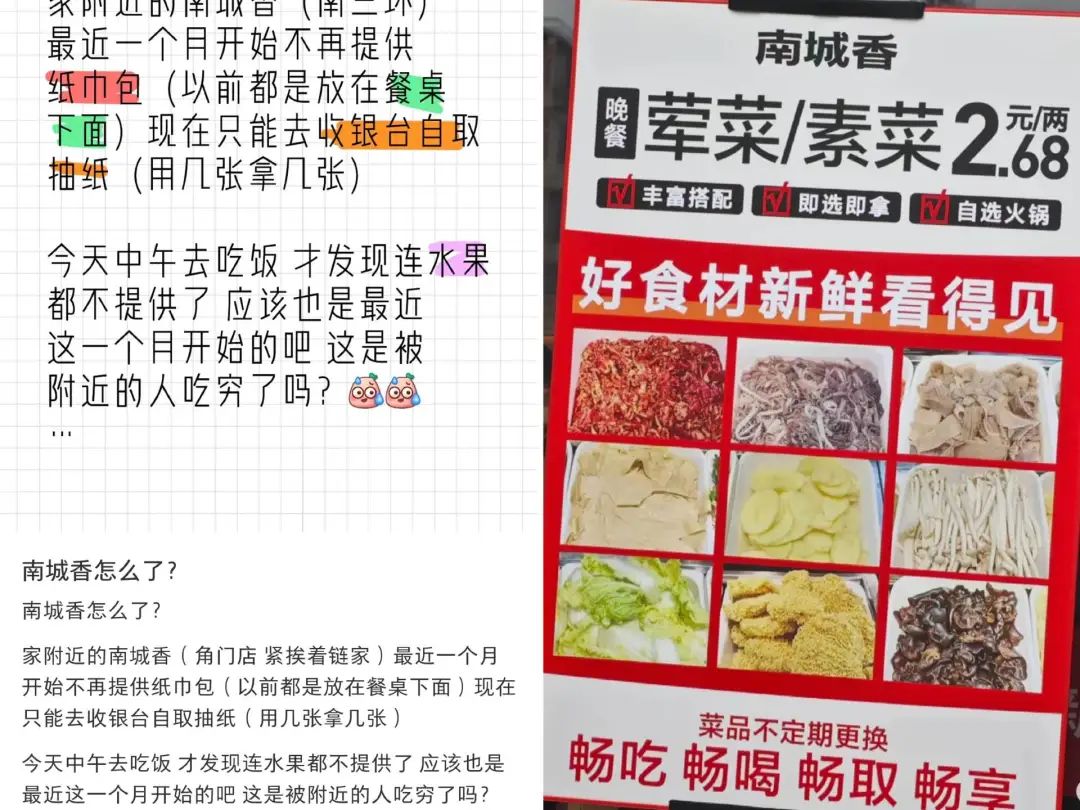 再比如,南城香已经把自助火锅改成了称重方式,相当于变相调价,同时防止浪费现象,降低成本。有网友观察到“南城香部分门店不提供纸巾和免费水果”。此前,汪国玉公开透露,“南城香决定明年取消免费水果。”