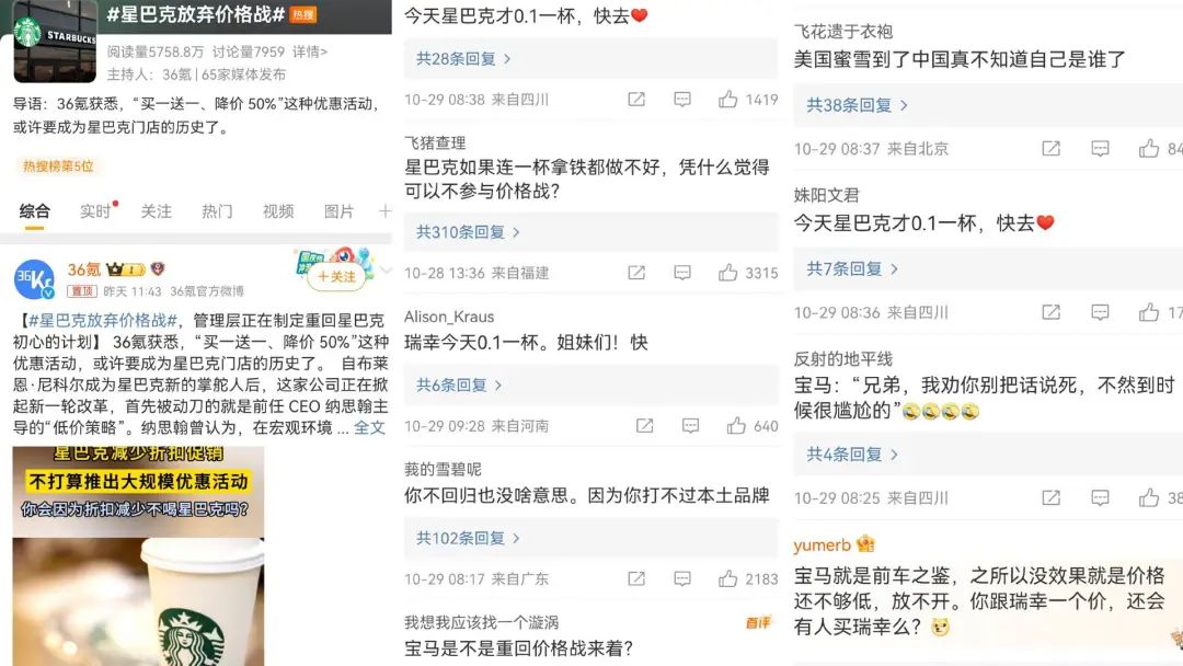 10月29日,#星巴克放弃价格战#登上微博热搜。据媒体报道,星巴克首席执行官布莱恩·尼科尔在9月份新任命后,将第一刀切成了“低价策略”。在北美等市场,星巴克完全取消了“买一送一”、“降价50%”等活动。