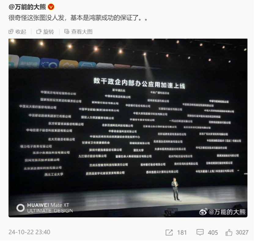 不过,有心人会发现,与这张图相对的,是下面这张图。“千余市企内部办公应用加速上线”,“万能大熊”博主说:很奇怪这张图没人发,基本上是鸿蒙成功的保证…