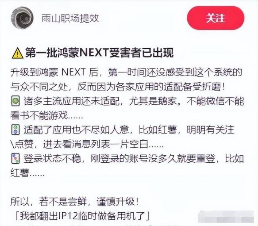 有些用户甚至说,如果不是为了感受新系统,他们就不会升级为鸿蒙系统NEXT,“鸿蒙系统NEXT的第一批受害者已经出现”。