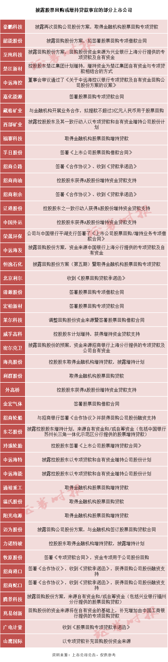据《证券时报》记者不完全统计,截至目前,已有40多家上市公司披露使用专项贷款资金回购股份或增持股东,部分公司已陆续披露具体回购或加持方案,相信上述名单还会进一步增加。