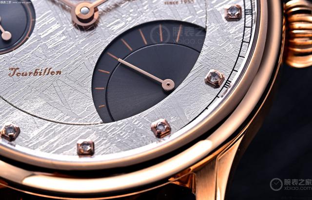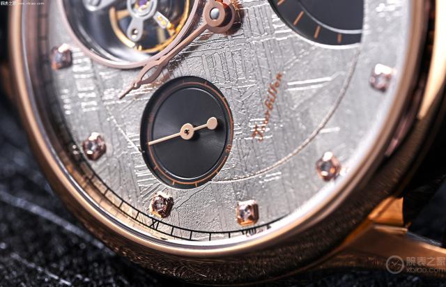 经过特殊的切割和酸蚀技术,新产品浩瀚陀飞轮和铁陨石制成的灰色表盘呈现出独特的魏德曼线条,这似乎是星空闪烁后的痕迹。因为这种线条是人工实验室无法模仿的,所以也是区分天然铁陨石的证明之一。陨石本身就是石头的颜色,所以整个表盘有一种冰裂般的冷寂美。