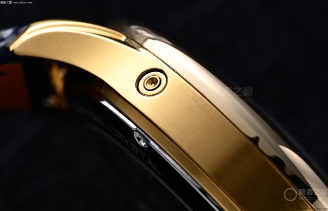 9 日历显示盘点位, 3 点的镂空设计巧妙地构成了对称美学;而且日期快调按钮巧妙地隐藏着 10 点的表壳侧面,这种隐藏设计方便佩戴者校准。