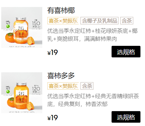 中国传统婚礼习俗本身就有喜茶的概念,新茶品牌喜茶生来就是吃这碗饭的。喜茶手持语言锤,自己的品牌名称,slogan「上加喜」使其切入跑道十分顺滑。还有类似的「喜柿多多」、像“有喜柿椰”这样有寓意的产品也很受欢迎。