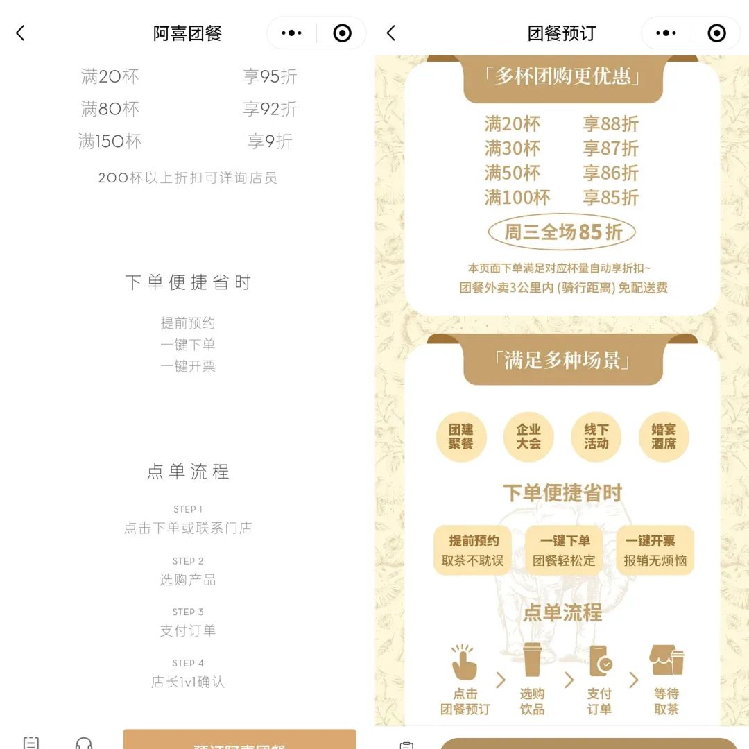 为吸引团餐购买,喜茶、霸王茶姬也都设置了团餐优惠。团餐只能在小程序下订单,免去了外卖平台的抽奖。