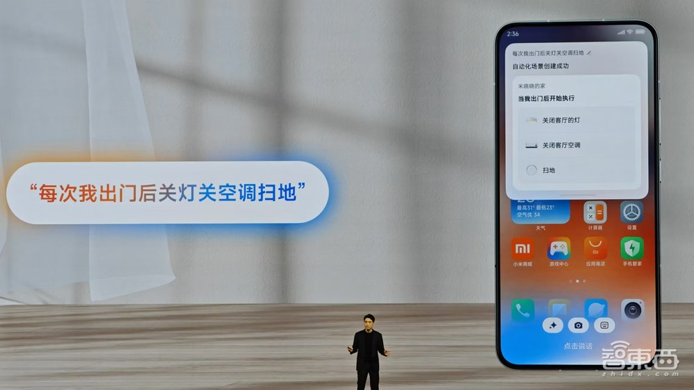 我们只需要对小爱说一句话,就可以创造出智能家居多设备自动化的场景,比如“每次出门都关灯关空调扫地”,可以用一句话设置。