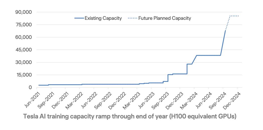 根据特斯拉第三季度财务报告电话会议的数据,目前特斯拉的AI算率约为6.75万张英伟达H100芯片,最终实力约为67.5 EFLOPS。
