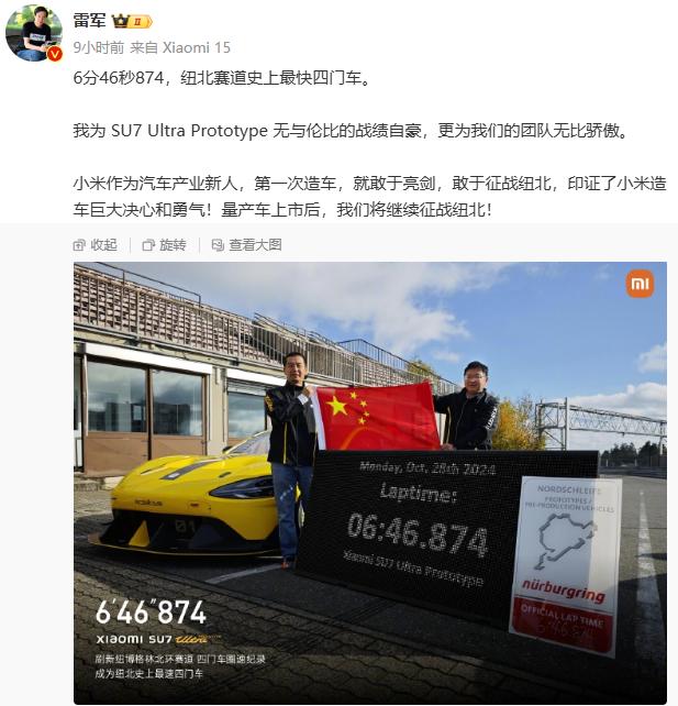 就在今年7月,雷军在年度演讲中立下的Flag刚过三个月,小米汽车便正式宣布小米SU7 Ultra 北京时间10月28日,Prototype以6分46秒874的成绩刷新了记录,成为“纽北最快四门电车”。