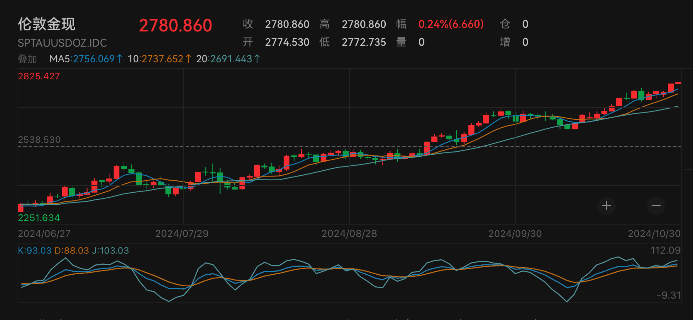 现货黄金上涨,触及2780美元/盎司,创历史新高,10月累计上涨近150美元。