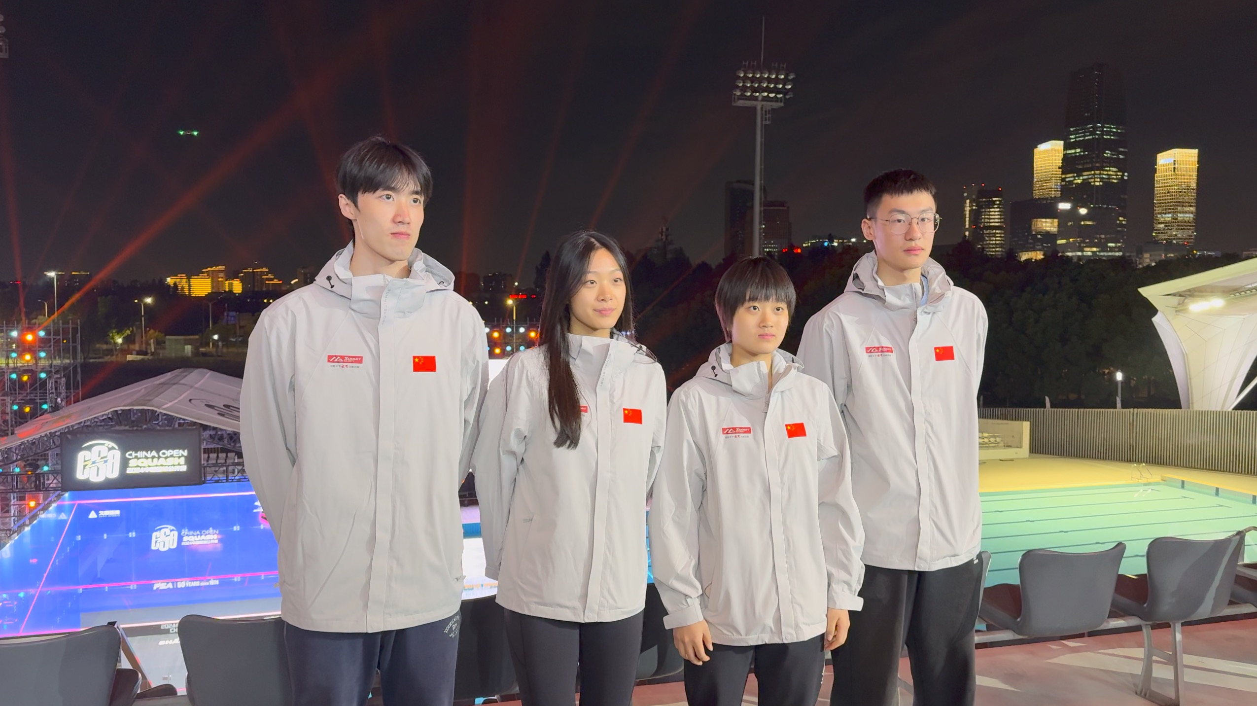 “我记得2016年我刚开始换壁球的时候,我也去现场看了这个中国联赛。然后我当时的感觉是壁球是这样的,这让我很震惊。我记得那一年我只有14岁。”“月亮湾”赛事启动仪式结束后,李海圳和澎湃新闻主办国球员持外卡参赛。(www.thepaper)分享他和壁球的故事。
