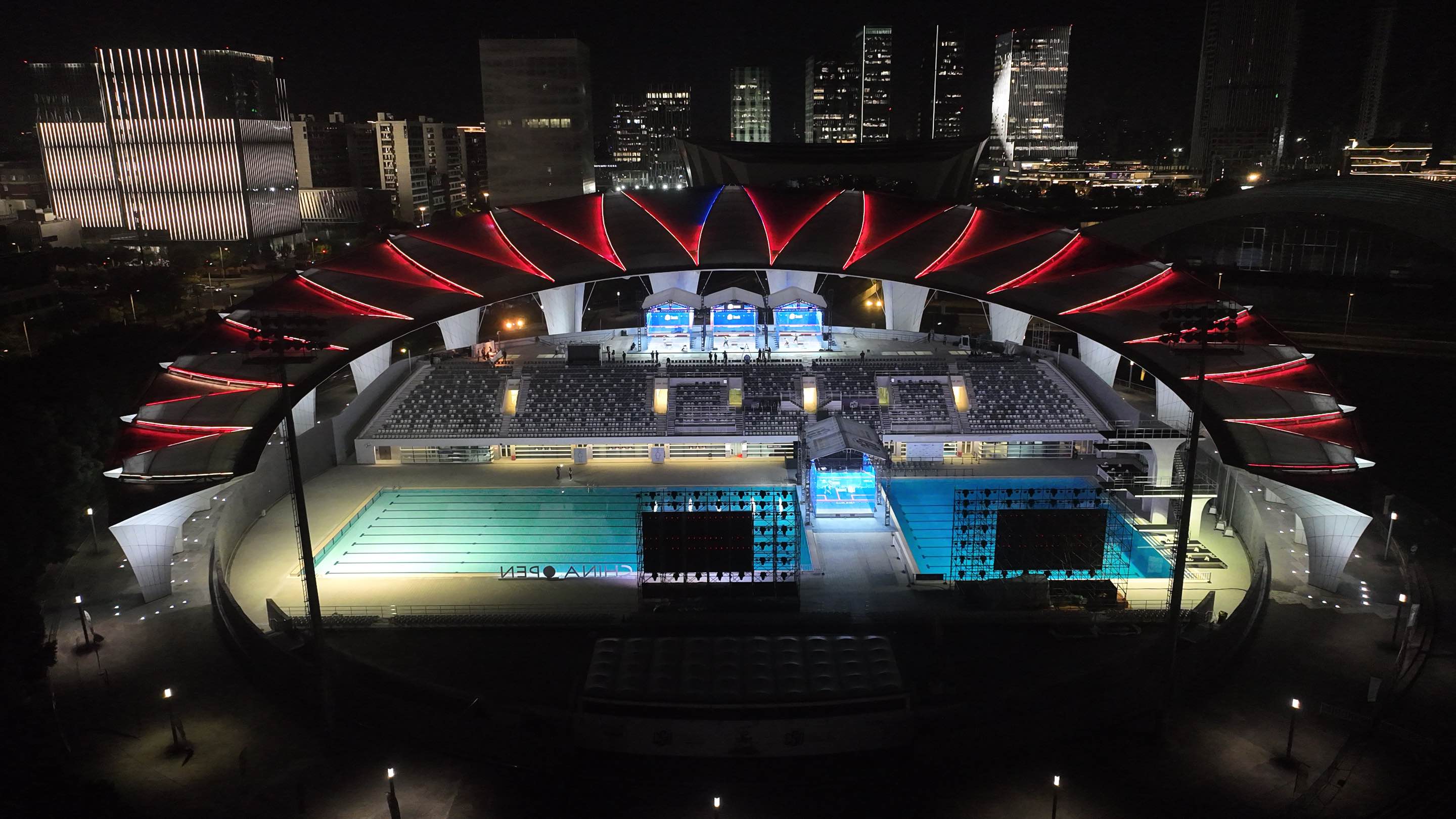 组委会制定了4个符合国家顶级比赛标准的玻璃体育场,不到半个月就完成了高质量的建设。其中,中央体育场建在月亮湾的游泳池中间,晶莹剔透如水晶宫,融合了月亮湾的清波和徐汇滨江的天际线轮廓,展现了上海蓬勃发展的城市形象。