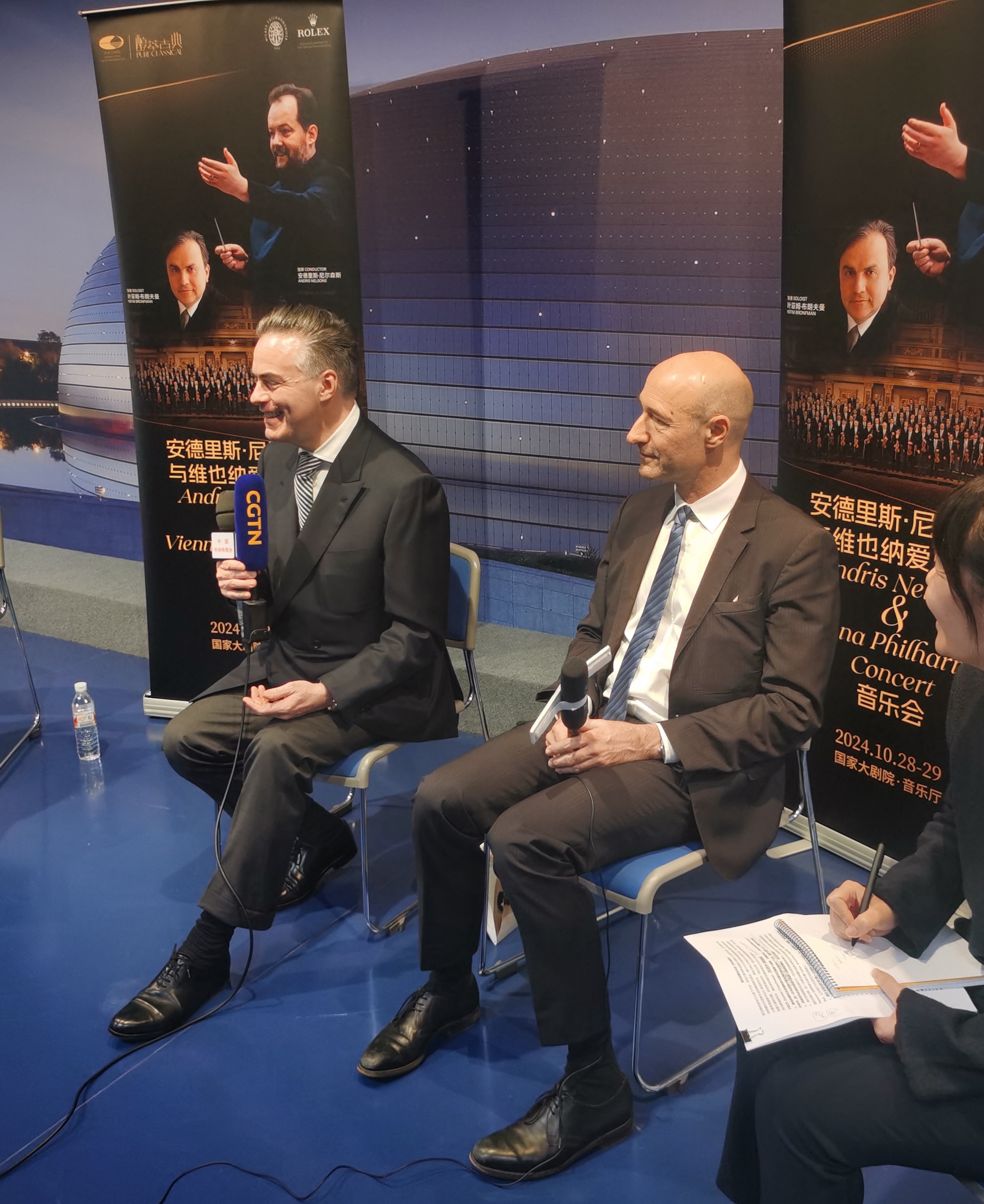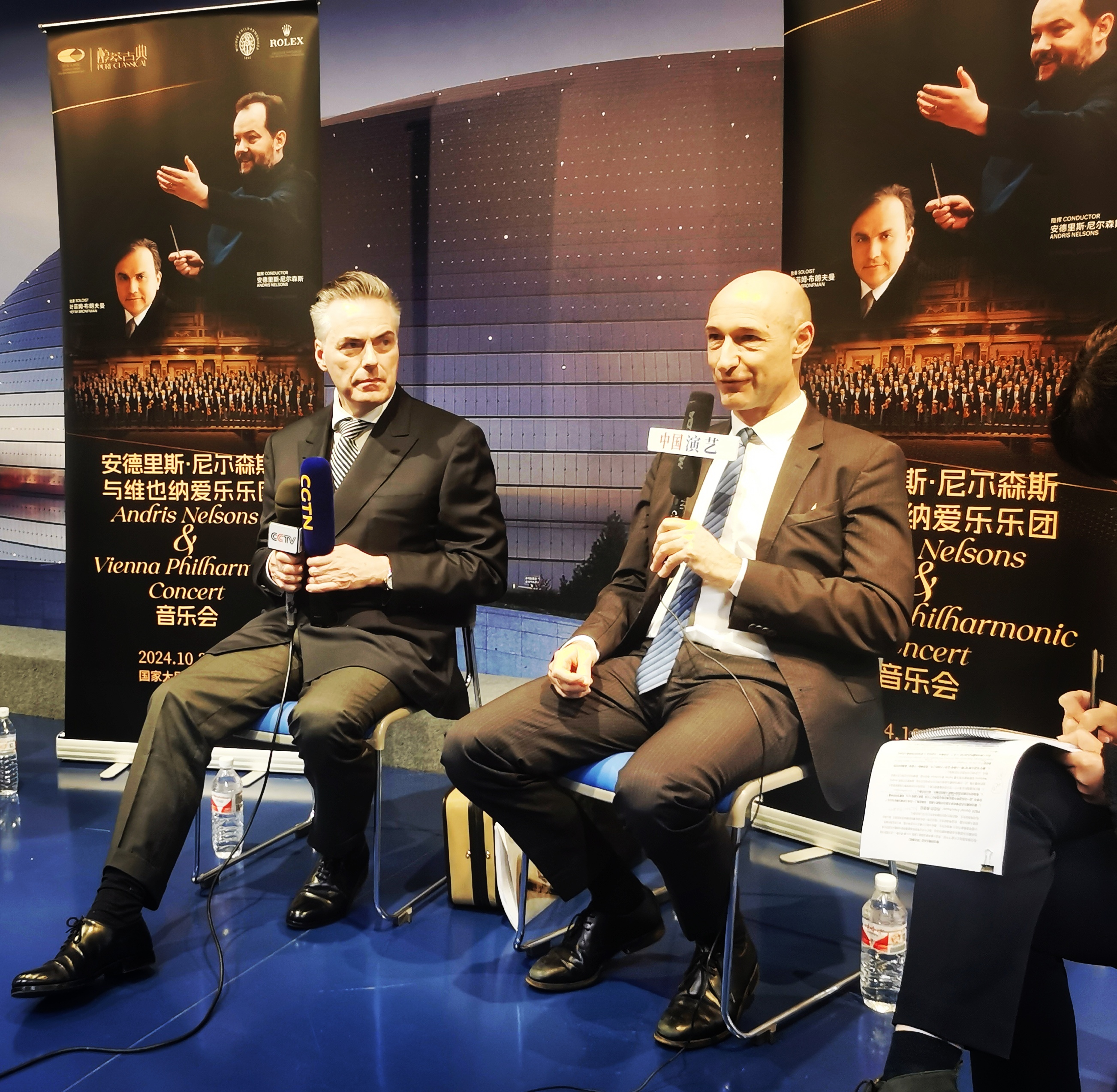 维也纳爱乐乐团主席、小提琴演奏家丹尼尔·弗洛绍和乐团总经理、低音提琴演奏家迈克尔·布拉德勒也在国家大剧院接受媒体采访。弗洛绍说:“这座美丽的建筑让我和爱乐乐团的每一位演奏者都充满了归属感,在这里演奏音乐就像回家一样。”