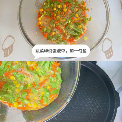2、1 ⃣️将蔬菜碎倒入蛋液中,加入一勺盐,搅拌均匀。加热电饼铛,倒入蔬菜糊中。 ✨电饼铛不需要给油;若使用平底锅,需在锅中喷少量食用油✨