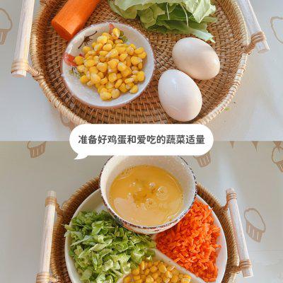 1、准备好所需的配料。 ✨蔬菜碎片可根据喜好随意组合(颜色搭配红黄绿会更好看,或加一点火腿丁)✨ ⚠️注:不要放太多配菜,容易做不成形;如果蔬菜确实太多,可以再放一点玉米粉帮助成形;❗️