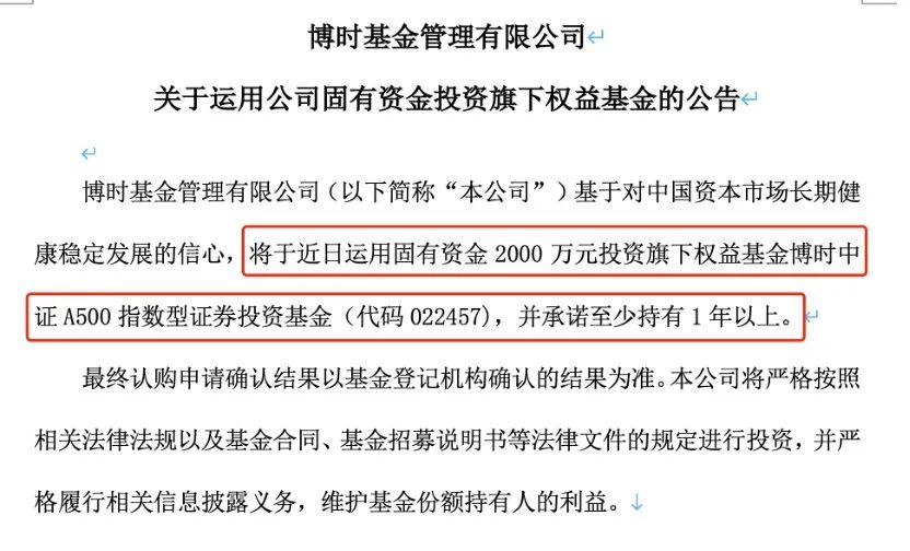 十月二十九日,景顺长城再次宣布,将以1500万元的固有资金投资其中证A500ETF连接基金,并承诺拥有至少一年的资金。值得注意的是,景顺长城还在其中证A500ETF首发期间进行了超过1600万元的自购。自购总额超过3100万元。