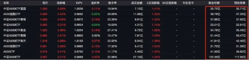 当CSIA500场外指数如火如荼的时候,10个场内的ETF规模也在不断创新高。截至10月25日,中国泰中证A500ETF总规模已超过450亿元,其中国泰中证A500ETF总规模已达118亿元。10月28日,ETF成交额超过27亿元,净认购额为17亿元,预计规模约为136亿元。其他CSIA500ETF的规模增长也不错。景顺长城和南方CSIA500ETF的规模分别超过50亿和42亿。此外,银华、摩根资产管理和投资等同类产品的规模紧随其后。