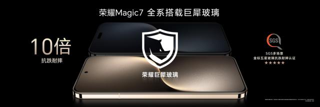 除设计创新外,荣耀 Magic7 该系列还在硬件配置方面进行了多次升级。整个系列手机已经升级到行业最高规格 IP68 和 IP69 防水,为用户提供更可靠的防水保护。与此同时,荣耀 Magic7 还配备了巨犀玻璃,进一步提高了手机的耐久性和抗摔性能。