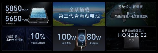 青海湖电池作为荣耀的专属技术,其第三代商品硅含量高达 10%,这种创意设计大大提高了电池的能量密度,从而为用户提供了更长的使用时间。同时,新一代荣耀都江堰 AI 通过智能调度和优化,电源管理系统完成了对电池容量的精细化管理,进一步提高了手机的续航能力。而且自研能效增强芯片 HONOR E2 加入,将进一步提升手机的能效比,让荣耀更加辉煌 Magic7 该系列在续航方面表现良好。