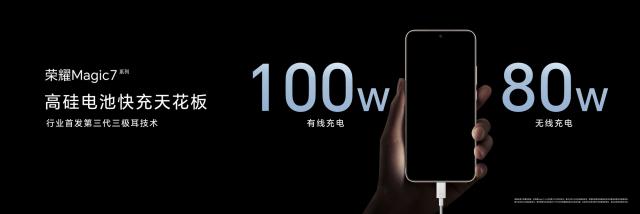 就快充技术而言,荣耀 Magic7 该系列也不负众望。荣耀通过行业第三代三极耳技术成功实现了高硅电池的快充天花板,支持高达 100W 有线充电和 80W 无线充电。这种技术的突破,使用户能够在更短的时间内给手机充电,大大提高了使用效率。
