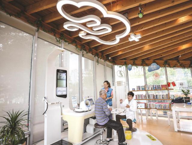走进“观健”,用“苍蝇再小,五脏俱全”来形容并不夸张:小木屋配备了大量高科技、健康、智能的物联网设备,供大众免费使用。例如 T8 体征检测仪,居民只需刷身份证或医保卡即可开启一站式自助检测。身高、体重、体脂、腰围、血压、血氧、心电图等十几个指标一应俱全,只需几分钟就能充分了解自己的体征。