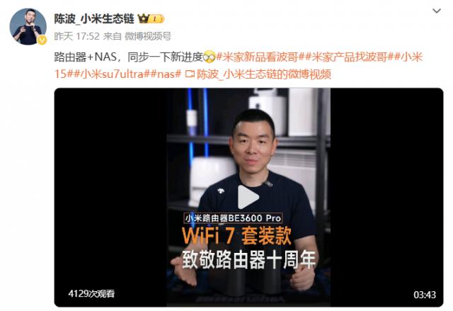 IT 世家 10 月 30 小米生态圈总经理陈波昨天发布了一段视频,介绍了小米路由器。 BE3600 Pro 和 NAS 商品的最新进展。