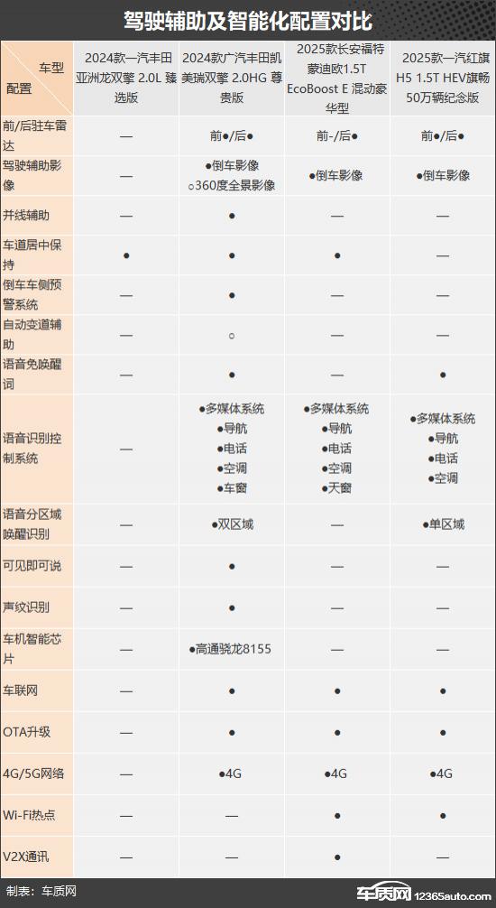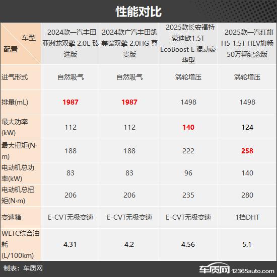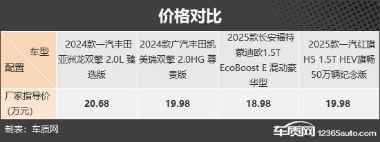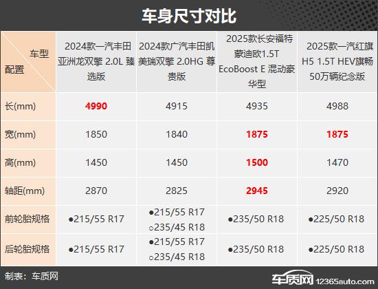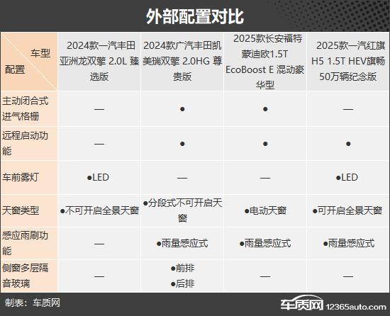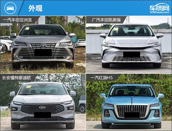 这次选择的四款车分别是 2024 一汽丰田亚洲龙(以下简称亚洲龙)、2024 广汽丰田凯美瑞(以下简称凯美瑞)、2025 长安福特蒙迪欧(以下简称蒙迪欧)和 2025 款一汽红旗 H5(以下简称:红旗 H5)。四款车都配备了混合动力系统,而且价格也比较接近。(因为现在照片数量很少,所以有些车型的照片并不是相应的特定风格)