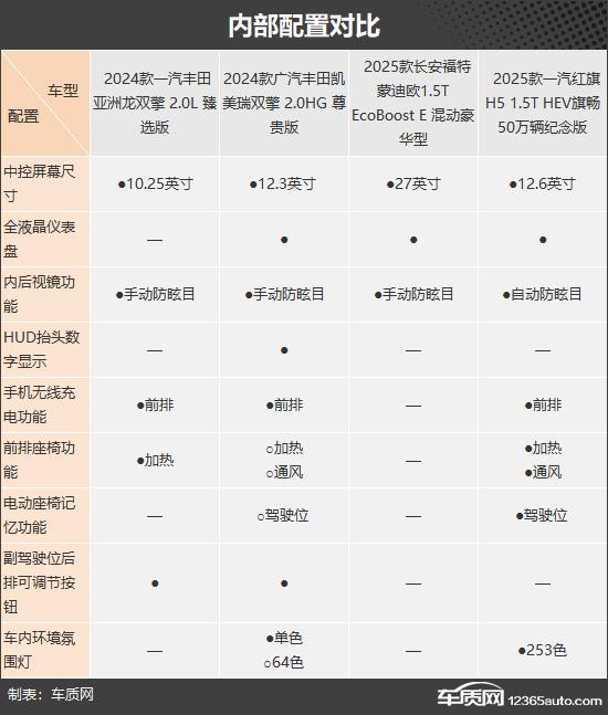 红旗内部配置 H5 专属自动防眩内后视镜,并标配前排座椅通风、驾驶座电动座椅记忆功能及驾驶座椅。 253 色彩车内环境氛围灯,用车体验更好。相比之下,蒙迪欧的内部设备性能略逊一筹,是四款车中唯一没有配备手机无线充电功能的车型,无法提供前排座椅加热车型。