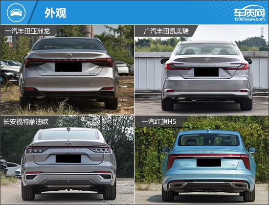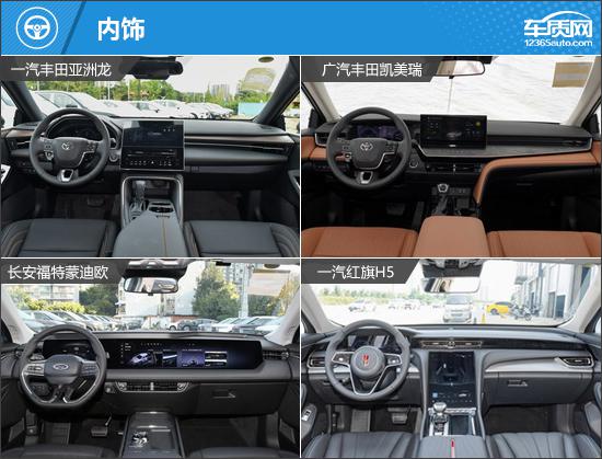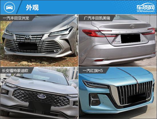 四款车的外观设计延续了各自品牌的最新家族式设计风格,具有较高的辨识度。亚洲龙的正面采用不规则造型的前格栅,具有很强的厚重感。车前两侧通风孔的设计,增强了运动感。凯美瑞的整体设计偏向于运动,两边的大灯就像“ C “字形,并与中间凹槽连接,起到视觉拉申作用。蒙迪欧采用扁平前脸设计,配合引擎盖上凸起的线条,营造出极强的运动氛围。红旗 H5 选用红旗品牌代表的大尺寸“直瀑式”进气格栅设计,内部结合粗糙的镀铬装饰条,极具稳定性。车尾部分,除凯美瑞外,其它三款车型均配有流行的贯穿式尾灯。选择“凯美瑞的尾灯组” C “形状设计,与前灯相对应,并通过装饰条连接。