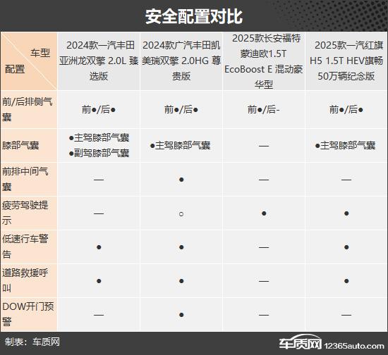 假如你最近正要开一辆出行费用较低的中型车,而且觉得充电比较麻烦,这次推荐的四款车都很值得考虑。这四款车型都来自国内一线车企,售后服务和产品质量都比较有保障。从以上对比不难看出,虽然亚洲龙在配置上略逊一筹,但在海外市场的定位远高于凯美瑞,是四款车中唯一配备副驾驶膝部安全气囊的车型。在配置水平方面,凯美瑞不仅表现出色,而且拥有四款车中最低的。 WLTC 综合油耗。蒙迪欧的优势在于它拥有四款车中轴距最长,并且独自享受。 V2X 通信,能提供更好的使用体验。红旗 H5 更加注重舒适性,是四款车中唯一一款可以开启全景天窗的车型,并且标配前排座椅加热。 / 通风。