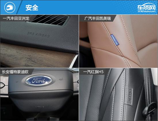 在安全配置方面,凯美瑞优于其它三款车型,独享前排中间气囊和 DOW 在开门预警的同时,还配备了主驾驶员的膝部安全气囊。亚洲龙是副驾驶员的专属膝部安全气囊。相比之下,蒙迪欧略逊一筹,是四款车中唯一没有配备膝部安全气囊、低速行车警告、道路救援呼叫的车型。