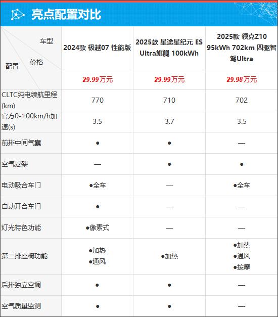 价格上,2025 星途星时代 ES 进入门槛降低到 20 万以下,顶配价格最贵的是 2025 款领克 Z10,超过了 30 一万元;2025年车型数量; 星途星时代 ES 提供 8 汽车供消费者选择,数量十分丰富。2025 款领克 Z10 还不错,共有 7 款车。2024 款极越 07 仅提供 3 款车。