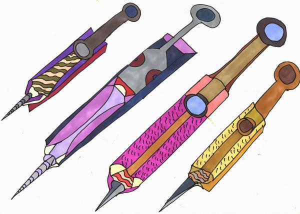 他会画出一些华丽而具体的想象——针管里有玫瑰色的粗糙悬崖或紫色的宫殿序幕,但它们仍然是一组针管。折扇的顶部有一张昆虫的脸,看起来像是愤怒地看着画外,但它仍然是一把蒲扇。