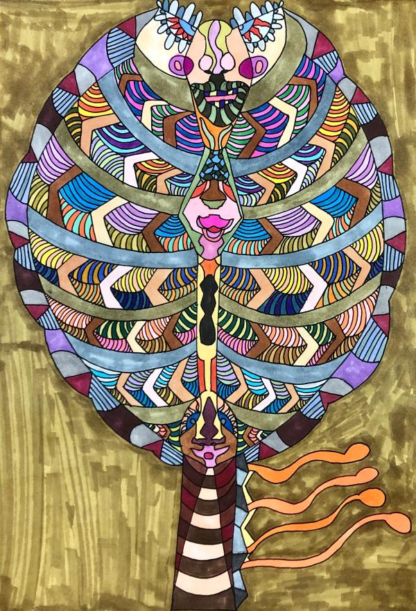 这个机构展示的一些画与疾病有关。李金给我展示了一个精神分裂症患者的作品,都是严格对称的。这种疾病让他非常焦虑,他需要在艺术中找到秩序感。