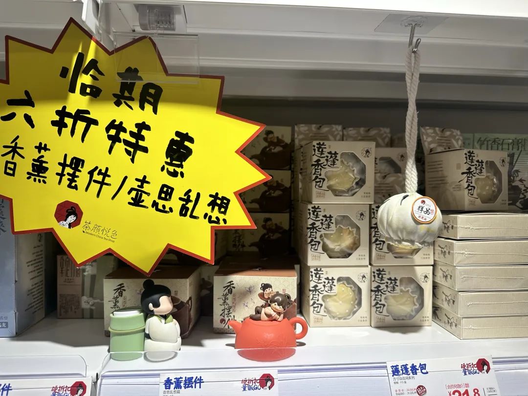 虽然喊着小吃店的名字,但这家店卖的商品品类包括现代中国茶店的茶叶、茶袋、马克杯、香薰等,甚至还有雨伞、地毯等商品。对于这家店的主要消费者来说:对于在茶颜小吃店种草的外国游客来说,店里提供的陪送礼物比零食还多。