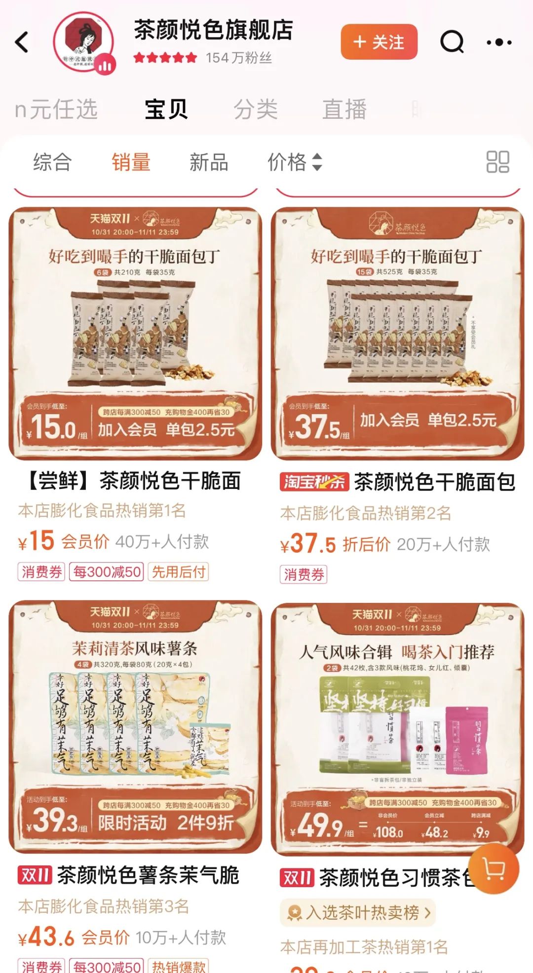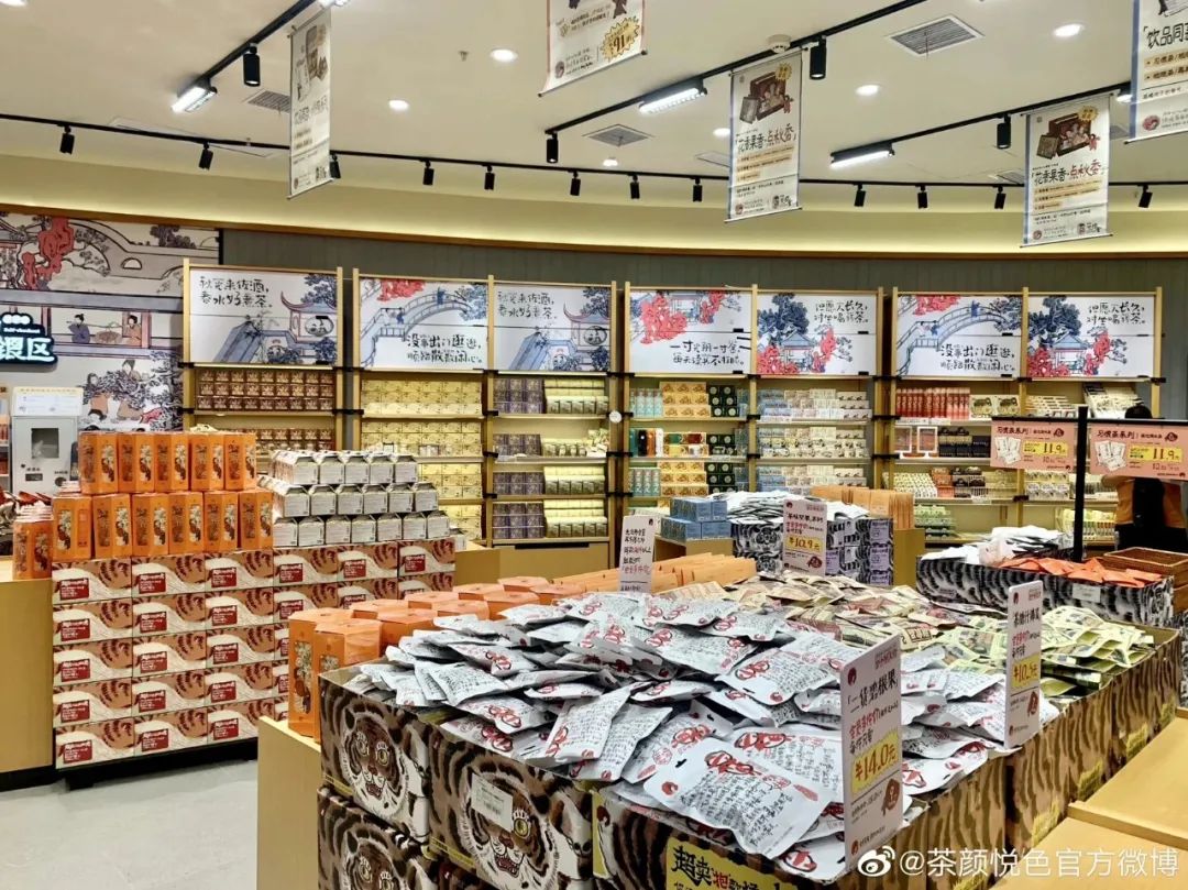 2019年,现代中国茶店在淘宝上推出官方店铺。那一年,茶颜的电商销售品类也仅限于一些纪念品和传统茶叶。次年,茶颜在网店同时推出了小包碧根果碎,此后几年,连续推出近30种自研零食。在这两种情况下,干脆面包丁和茉莉清茶味薯条是销售数据最好的两种,在天猫旗舰店各有40万和10万人次。沥金数据显示,近一年来,现代中国茶店在电商渠道的零食年销售额翻了12倍,销售额已经超过1亿元。