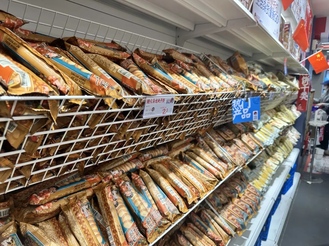在商店里,有几种超大的小吃放在最显眼的位置:一桶高的面包丁和薯条,还有一个可以独自环绕的“幽兰拿铁桶”。天花板上悬挂着几张大型商品海报。海报最突出的词是价格:每包2.3元。塑料盒和铁架子里挤了大量的零食和茶叶。乍一看,高饱和度的配色和复杂的包装就像游戏《抓鹅》页面:有点土,但人们真的很想买。