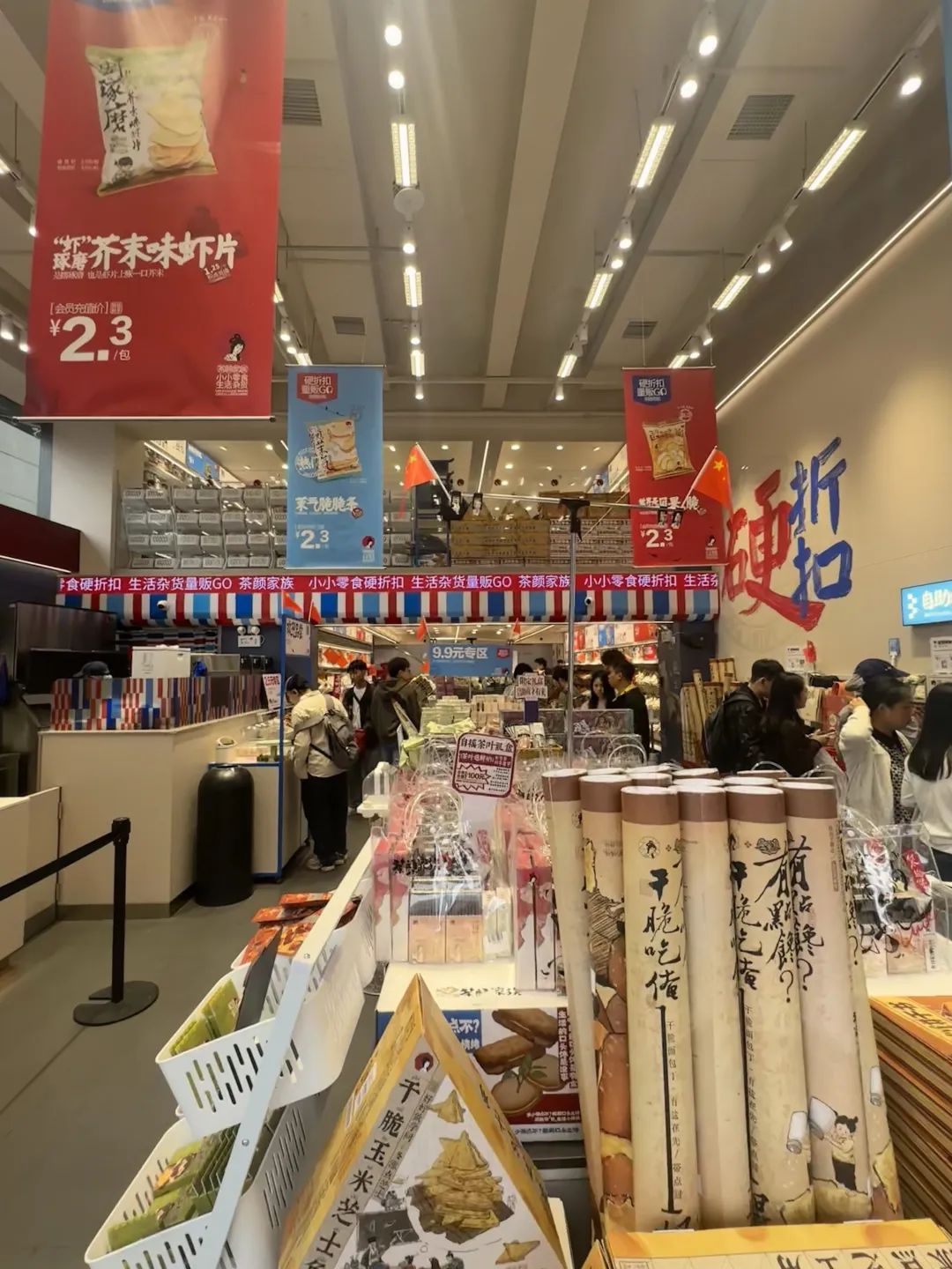 提着塑料购物篮的顾客可能也这么认为。无一例外,他们的篮子都装满了。根据刺猬公社的观察,购物篮里装满茶叶、零食和品牌的游客大多是外国游客,大部分都很匆忙,在假期的最后一天买了陪送礼物。三五成群的人在货架前悠闲地品尝,长沙本地的年轻人只拿了一两包零食放进篮子里。