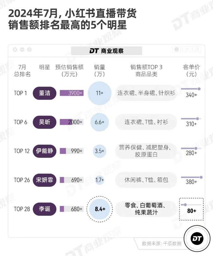 根据DT研究院的数据,李诞在7月份的小红书直播明星榜单中排名第五,预计销售额为680万,距离董洁榜首的3900万不等于一个数量级。