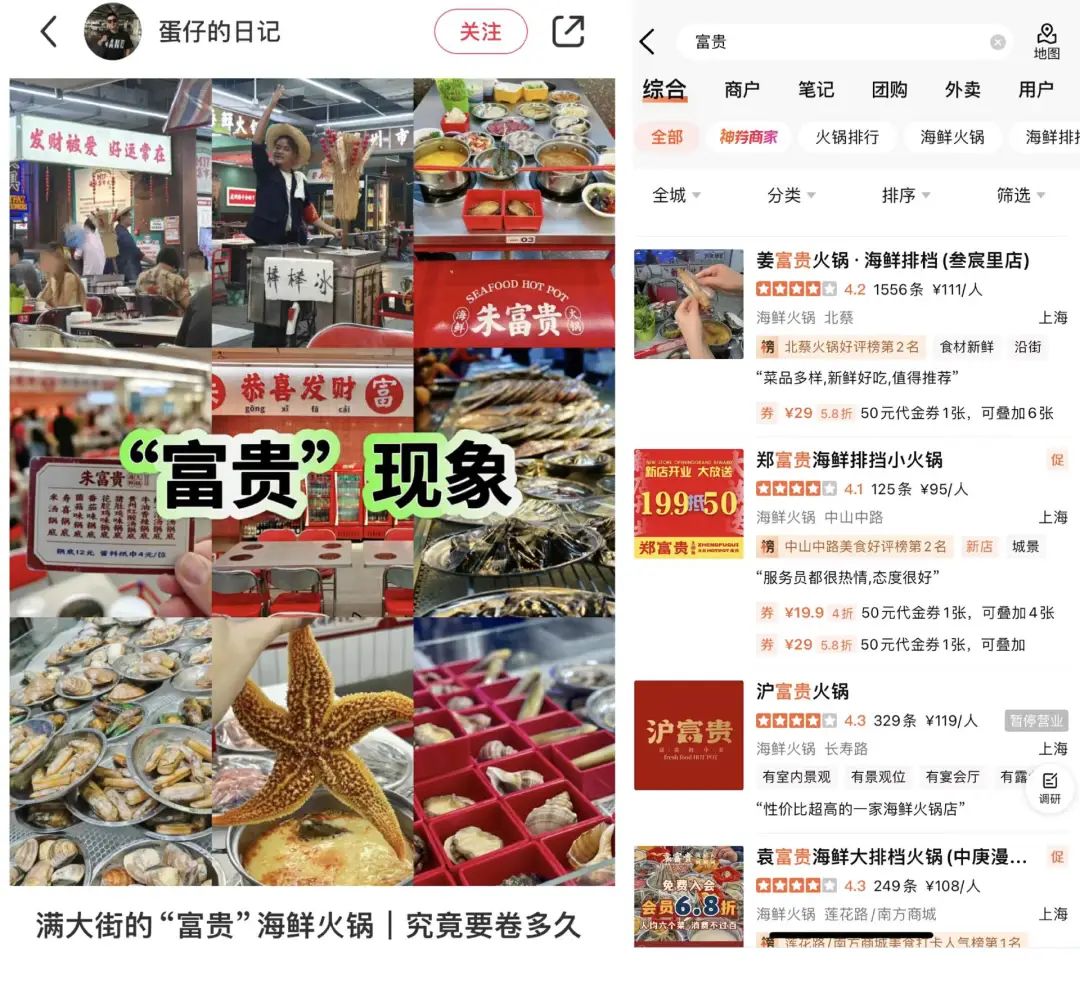此外,还有大量分散在全国各地的“财富系列”品牌,大部分门店只有一两家,如粮富海鲜市场火锅、同富海鲜排档火锅、财富 · 海鲜排档火锅,夏富贵 · 便宜的海鲜市场火锅...仅在上海,就有不少于20个“富贵系”火锅品牌。