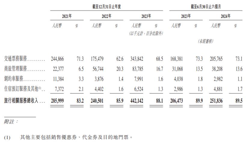 根据招股书,2021年、2022年、2023年和2024年1-6月(以下简称“报告期”),旅游业相关服务收入占公司总收入的80%以上,与在线推广服务、数据和技术服务相比,收入相对较低。