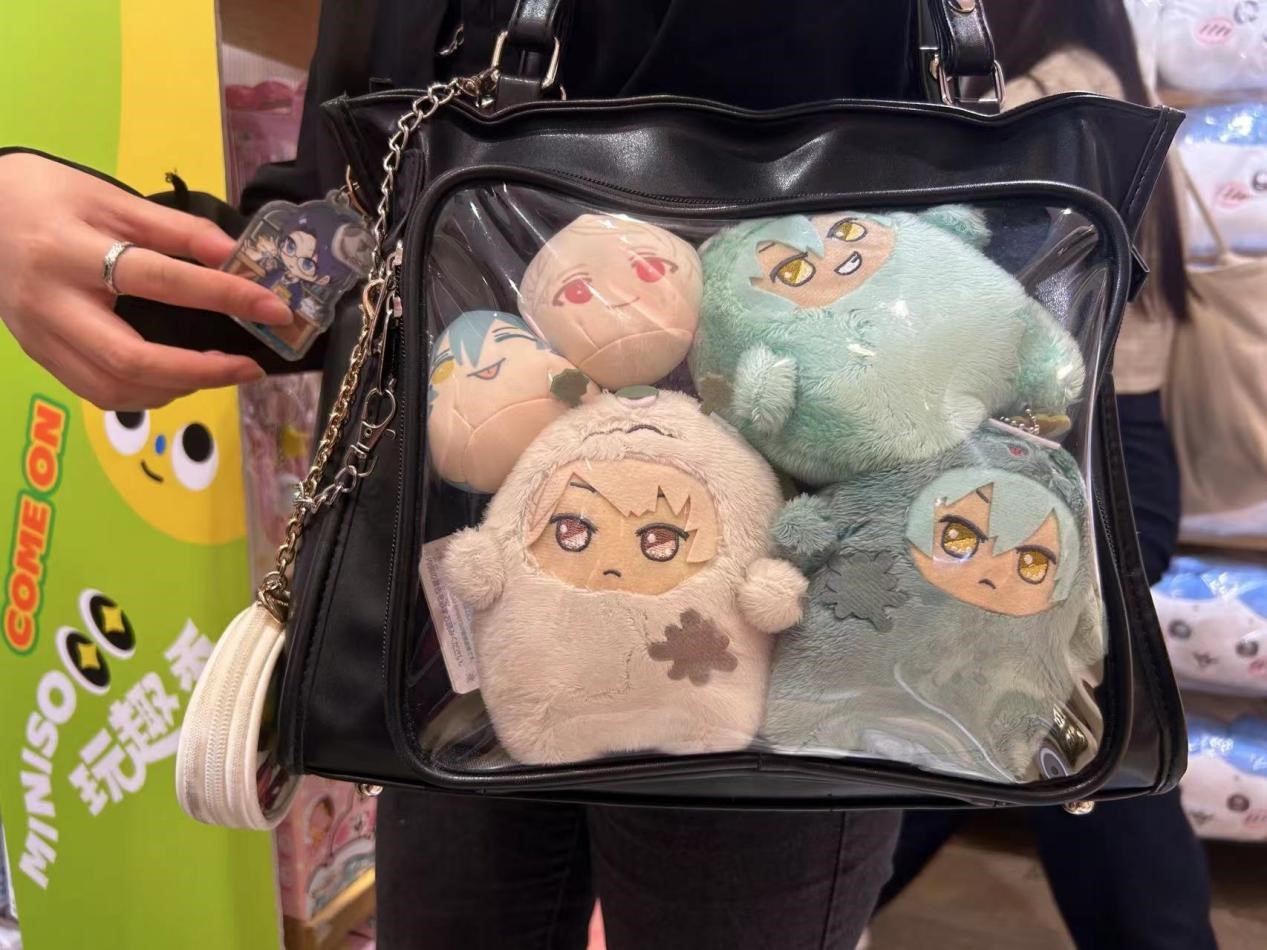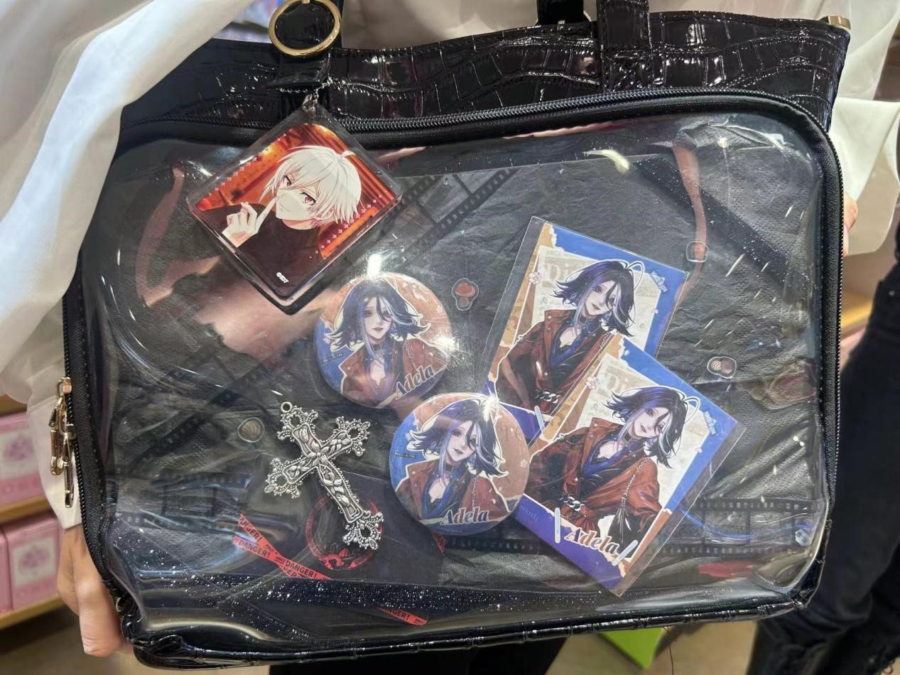 “二次元”突出了自己的品味和价值观,最典型的就是“痛包文化”。爱好者使用大量的吧唧(勋章)、娃娃、卡片等“二次元”周围固定在包外的透明隔层中,以显示个人喜好和个性。在日语中,痛包文化的“痛”字用来形容一种独特、夸张、引人注目的感觉,类似于“让人眼前一亮”或“独一无二”的含义。所以,痛包通常具有较高的视觉冲击和识别能力。