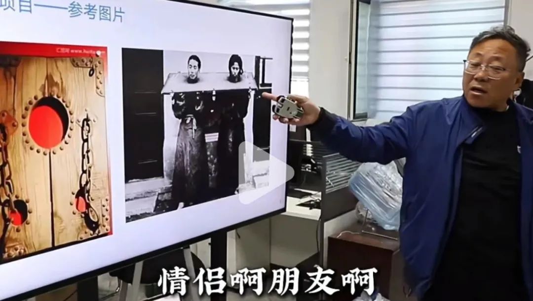 藏青色时尚囚服 实木对联大枷。